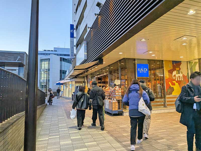 前方にKALDIの看板が見えますので、そちらのほうに進み、階段を下りてKALDIの横の道を直進してください。